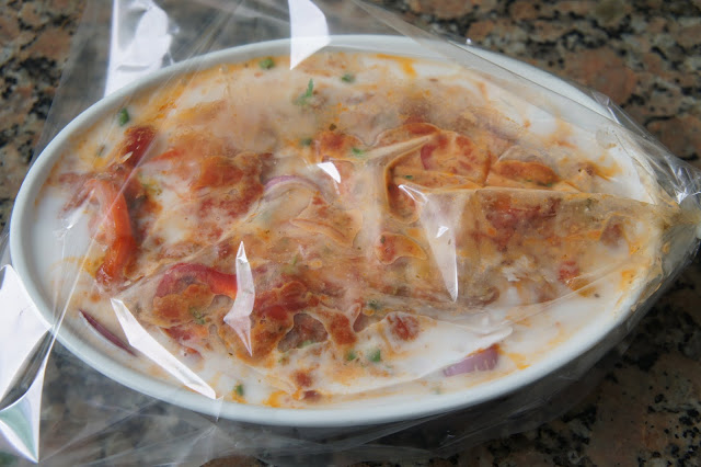 Coloquei num saco de assar (pode ser papel laminado também) e leve ao forno a 180 graus por 30 minutos.