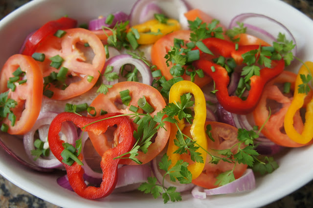 Por cima distribuí as fatias de cebola, tomate, pimentão e o cheiro verde.