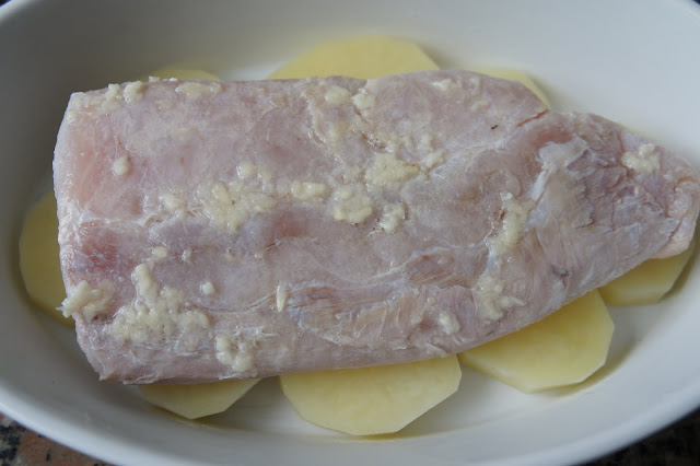 Enquanto isso, descasquei as batatas, cortei em rodelas e levei ao fogo com água e sal para dar uma cozida rápida. Encorri as batatas e comecei a montagem do prato. Num refratário fiz uma caminha de batatas e acomodei o filé de peixe em cima.
