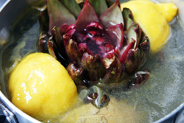 Coloque a alcachofra na panela e complete com água até cobri-la. Coloque o limão e um prato fundo por cima, para que ela não flutue. Cozinhe por 40 minutos ou até que as pétalas se soltem com facilidade.