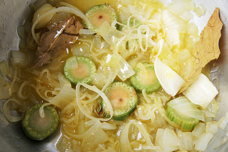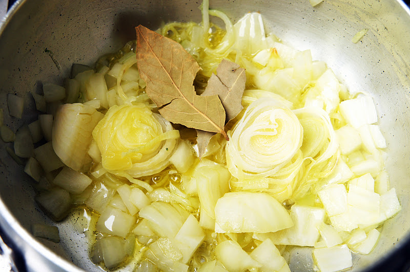 Numa panela coloque o azeite para esquentar e acrescente a cebola picada. Refoque um pouco e acrescente o alho-poró e o louro.